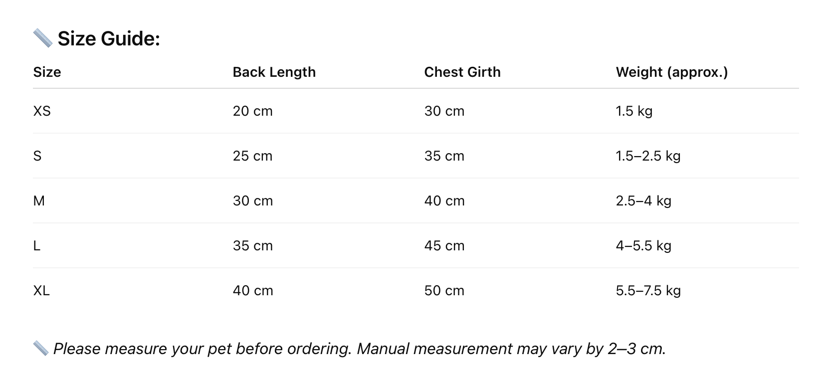 Please measure your pet before ordering. Manual measurement may vary by 2–3 cm.